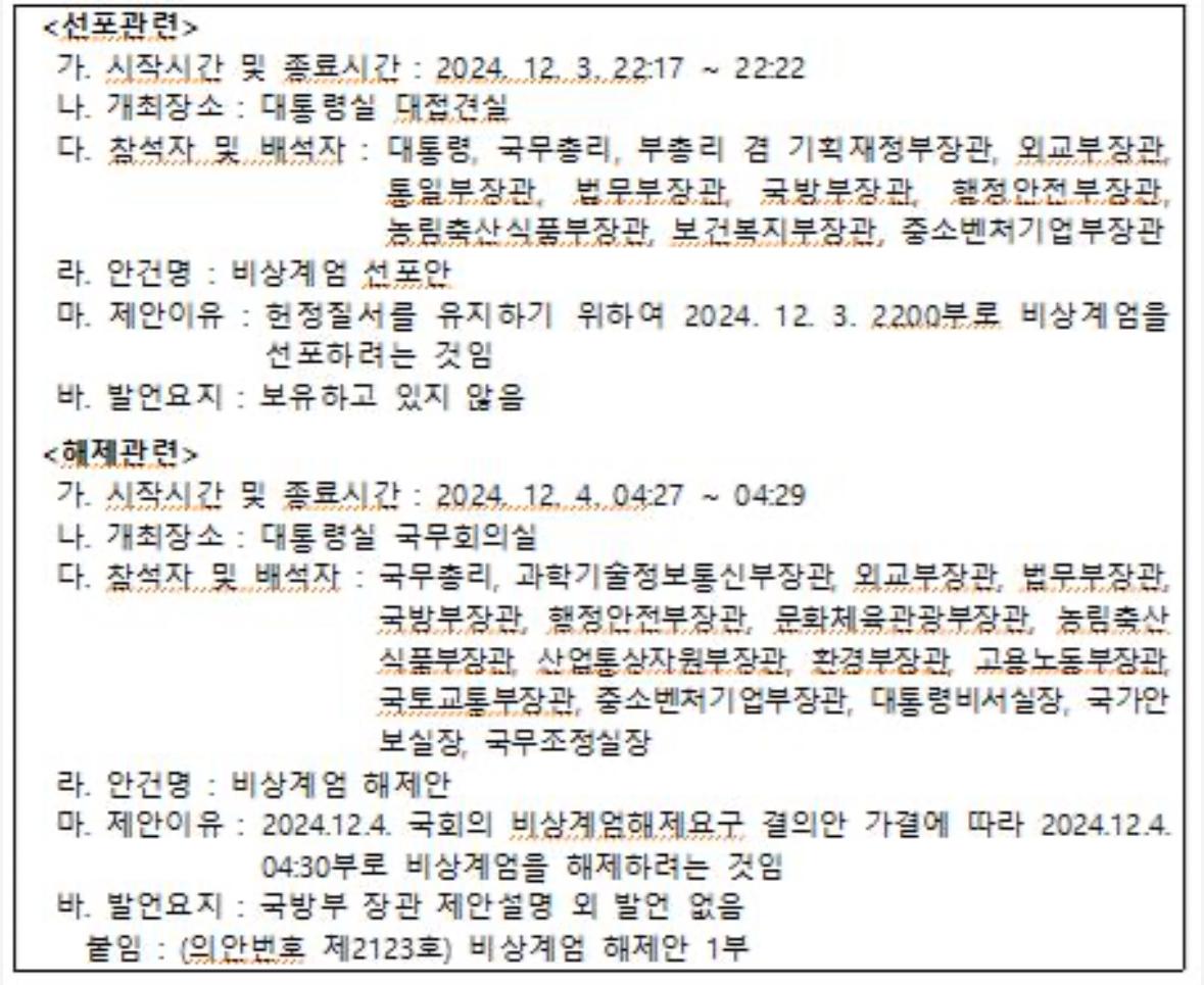 참석자는 윤석열 대통령, 한덕수 국무총리, 김용현 전 국방부장관, 이상민 전 행안부장관, 최상목 경제부총리 겸 기획재정부 장관, 조태열 외교부 장관, 김영호 통일부 장관, 박성재 법무부 장관, 송미령 농림축산식품부 장관, 조규홍 보건복지부 장관, 오영주 중소벤처기업부 장관이다.